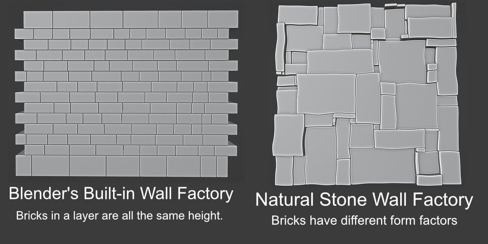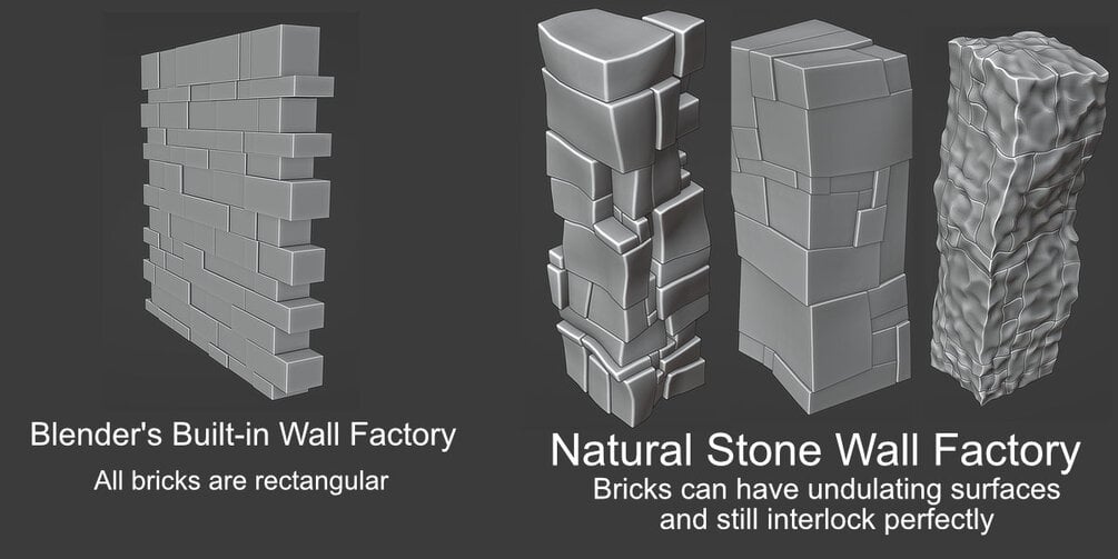 Stop manually pulling verts to create stones that interlock.  Use this add-on to automatically create stone floors, walls, and columns with bricks that interlock perfectly even in three dimensions.