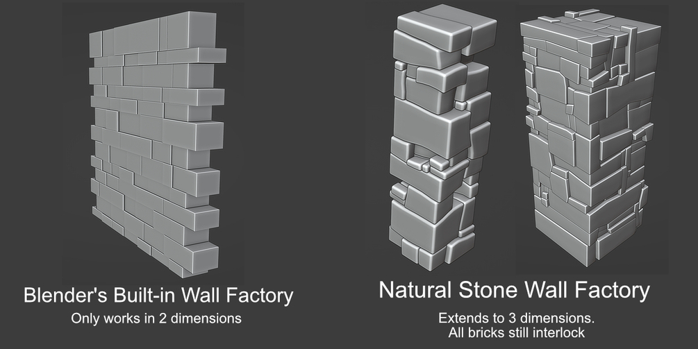 Stop manually pulling verts to create stones that interlock. Use this add-on to automatically create stone floors, walls, and columns with bricks that interlock perfectly even in three dimensions.